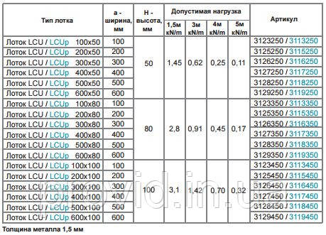 1) Оптимальний набір комбінацій ширини та висоти лотка, а також товщини металу (1,5 мм — 2,0 мм)